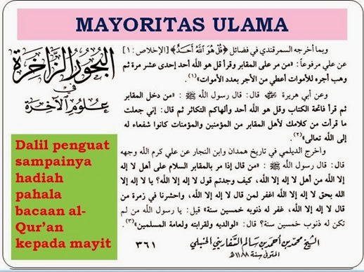 Dalam kasus masalah ini salah satu kalam ulama yang di jadikan sebagai argumen mereka adalah pendapat Imam Syafii tentang masalah sampai pahala bacaan al-quran bagi mayat, biasanya mereka mengutip nash kitab Ibnu Katsir dalam dalam kitab Tafsir al-quran al-`Adhim jilid 4 hal 268 cet. Dar Fikr thn 1997: